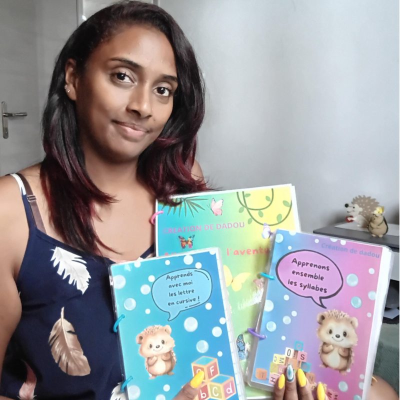 Ma passion pour l’éducation et l’apprentissage m’a naturellement conduite à créer Les Livrets Aventures de Dadou, une collection où chaque livret transforme l’apprentissage en une véritable aventure. Je conçois mes livrets avec soin pour stimuler la curiosité, la créativité et le plaisir d’apprendre, tout en intégrant des éléments adaptés aux enfants DYS ou ayant des besoins spécifiques.